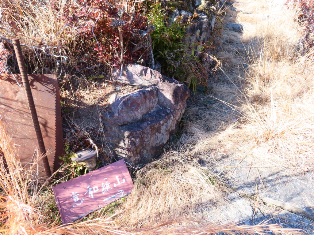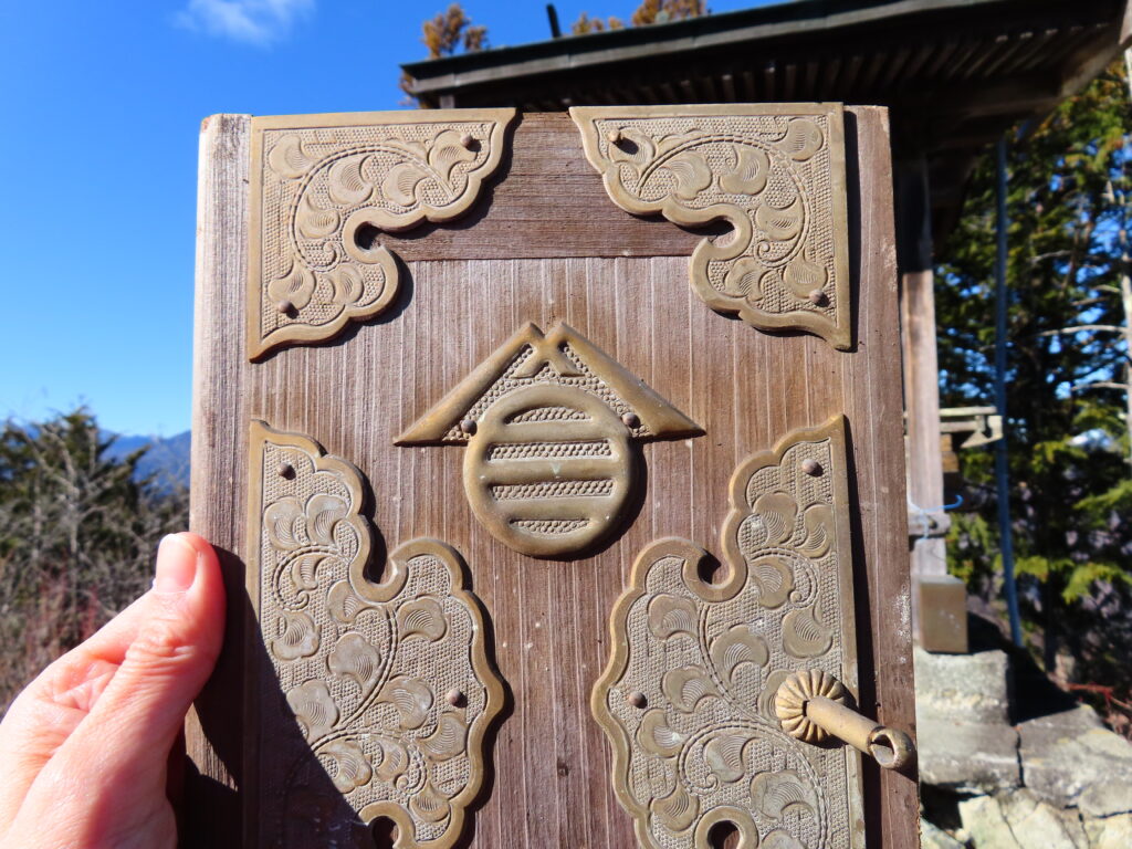 山頂のすぐ下に、【不動明王】の祠跡がありました。かなり朽ちていて中は空っぽでしたが、ここにも【山丸三】が型取られていました。