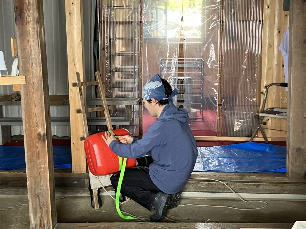 その青年は角間洋平くんと言って、荷上げ(歩荷)の仕事で山小屋へ来ており、そこで知り合いました。角間くんは、三ノ池の御神水を汲む仕事や、強力(御嶽講の荷運び・案内)の仕事も請け負っており、日常から御嶽山へ深く関わる青年です。